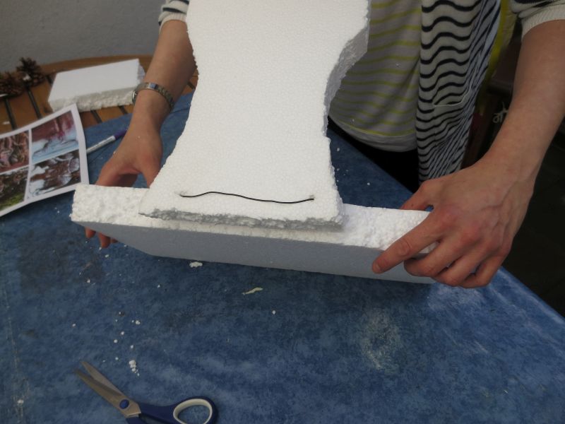 Die Arme modelliere ich zunächst mit Alufolie über einen Draht. Dann stecke ich die Enden des Drahtes in den Schulterbereichen der Styroporplatte fest.