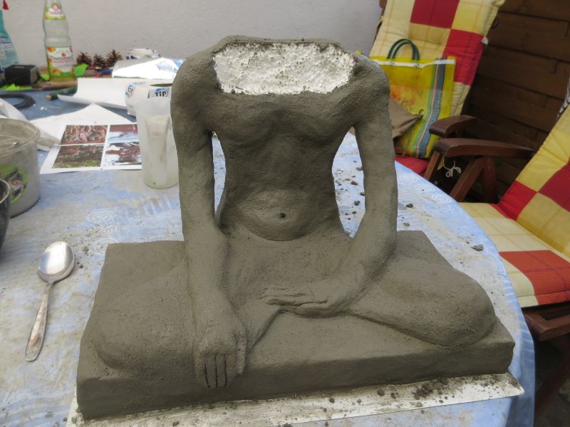 Für den Kopf lege ich wieder etwas übriggebliebenen Styropor unter. Höhenunterschiede gleiche ich mit etwas weiterem Moosgummi aus. Wichtig ist nur, dass die ganze Figur gut liegt und keine Spannungen entstehen, die nachher zu Rissen führen.