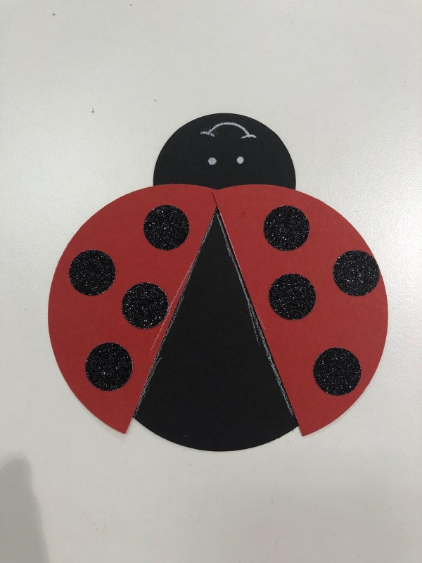 Für die kleinen Marienkäfer mit dem kleinen 1,6cm Stanzer aus schwarzem und rotem Fotokarton ausstanzen. Die roten Kreise halbieren, mit einem schwarzen Marker die Punkte aufmalen und als Flügel auf die schwarzen Kreise kleben.