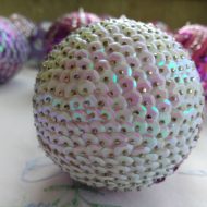 Auf eine Stecknadel eine Pailletten aufnehmen und in die Styroporform drücken. Hierbei darauf achten, dass die Pailletten-Schüsselchen immer in die gleiche Richtung zeigen. Üblicherweise legt man die Pailletten mit der Rundung nach unten, leicht überlappend, auf die Styroporform auf.