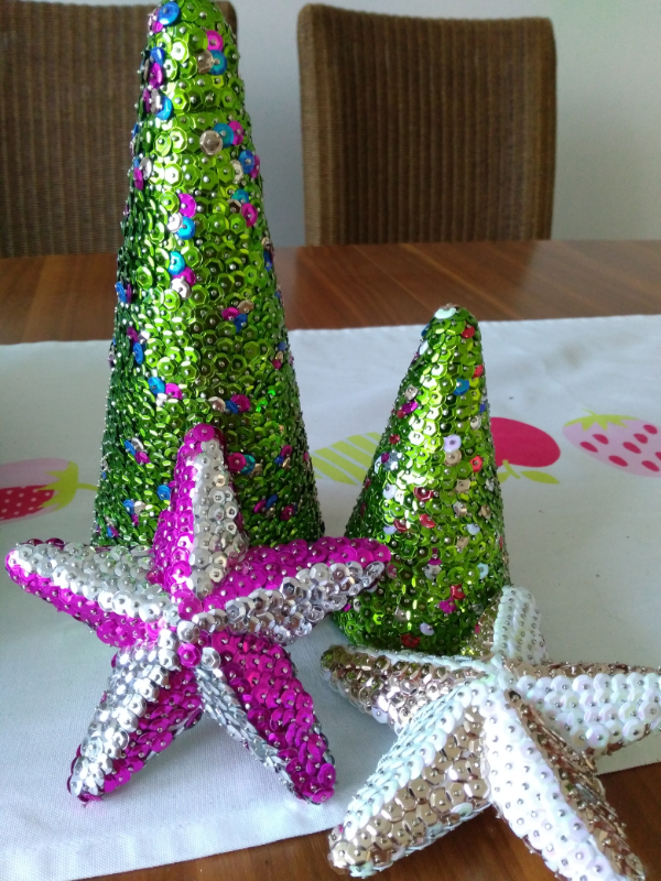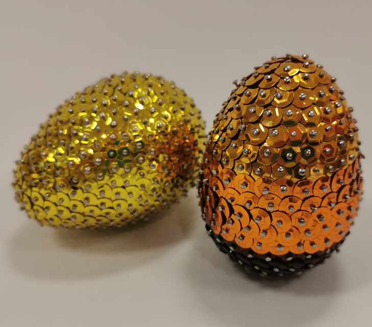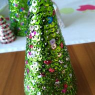 Die Menge an benötigten Nadeln und Pailletten hängt davon ab, wie dicht die Pailletten gesteckt werden. Für eine mittlere Styroporform (ca. 20cm hoch) benötigt man z.B. in etwa 3500 – 4000 Pailletten bzw. Nadeln.