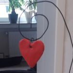 - Den Draht mit einem Ende in das Loch im Holz kleben und auf der anderen Seite zu einem Kringel drehen und das Herz einhängen.